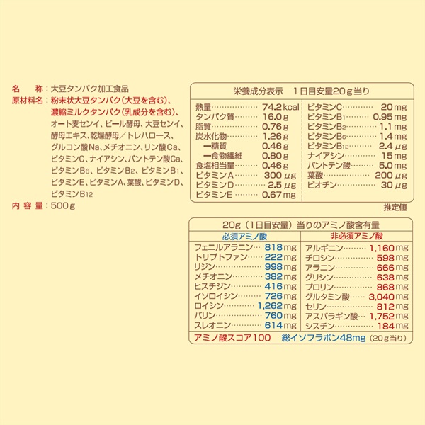 ■原材料/粉末状大豆タンパク(アメリカ製造)、脱脂大豆、乳タンパク、ビール酵母、オーツ麦粉、酵母エキス、乾燥酵母/トレハロース、グルコン酸Na、DL-メチオニン、第二リン酸Ca、レシチン、ビタミンC、ナイアシン、パントテン酸Ca、ビタミンB6、ビタミンB2、ビタミンB1、ビタミンE、ビタミンA、葉酸、ビタミンD、ビタミンB12